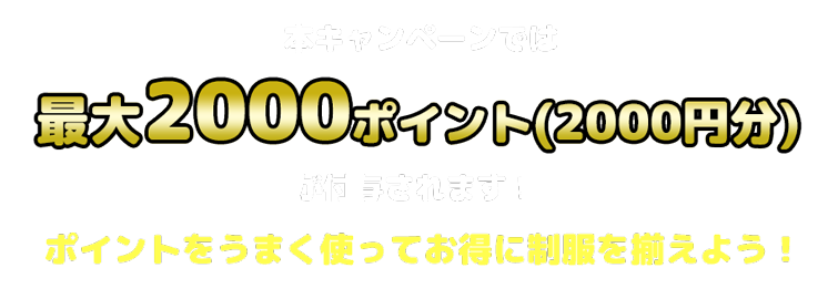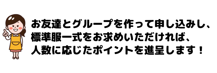 ※ ポイントの付与日は、2月23日以降にグループメンバーの標準服一式購入が確認出来次第付与致します。即日付与は行っておりませんので注意ください。(最大2週間程度かかります)